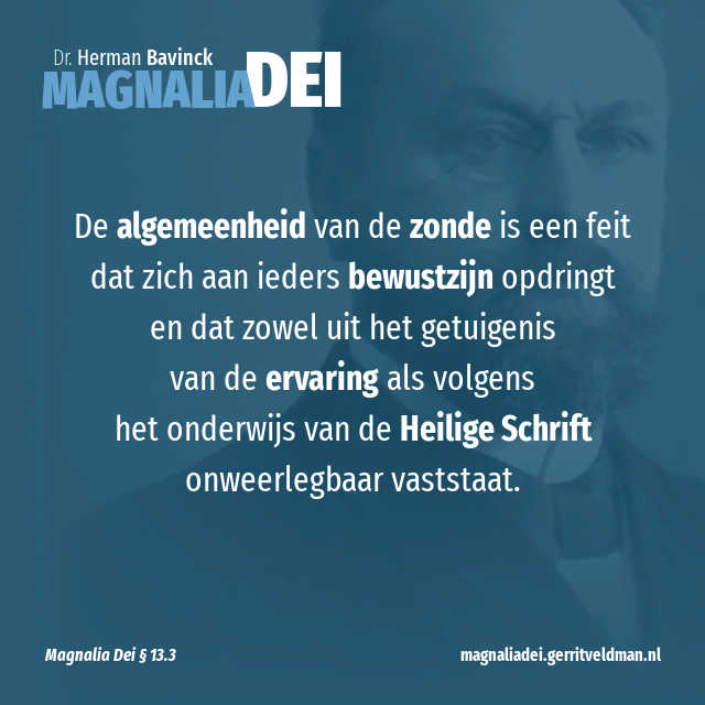 En dat is altijd het gevolg van de zonde. We verliezen er tegenover God, tegenover onszelf en onze medemensen de innerlijke, geestelijke vrijmoedigheid door die alleen het bewustzijn van de onschuld in onze harten kan verwekken. Maar de verschrikkelijkheid van de eerste zonde wordt nog veel sterker openbaar doordat die zich van het eerste mensenpaar uitbreidt over de hele mensheid. De eerste stap in de verkeerde richting is gezet en alle nakomelingen van Adam en Eva wandelen hen na in hetzelfde spoor. De algemeenheid van de zonde is een feit dat zich aan ieders bewustzijn opdringt en dat zowel uit het getuigenis van de ervaring als volgens het onderwijs van de Heilige Schrift onweerlegbaar vaststaat.