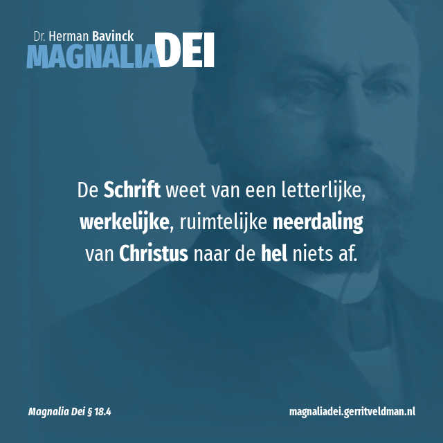 De grote verscheidenheid van opvattingen bewijst dat de oorspronkelijke betekenis van de woorden ‘neergedaald in de hel’ verloren is gegaan. We weten niet waar het artikel vandaan komt en evenmin wat men er eigenlijk mee bedoeld heeft. En de Schrift weet van een letterlijke, werkelijke, ruimtelijke neerdaling van Christus naar de hel niets af. Petrus past de woorden van Psalm 16 op Christus toe: ‘U zult mijn ziel in de hel niet verlaten en zult uw Heilige niet overgeven om ontbinding te zien.’ Hand. 2:26 Maar de kanttekening merkt terecht op dat hel hier opgevat moet worden in de zin van graf. Hoewel Christus wat betreft zijn ziel in het paradijs was, verbleef Hij toch wat betreft zijn lichaam in het graf en verkeerde Hij tussen zijn sterven en zijn opstaan in de staat van de dood. Paulus zegt dat dezelfde die opgevaren is, eerst is neergedaald in de onderste delen van de aarde. Ef. 4:9 Maar hierbij moeten we niet denken aan een neerdaling in de hel, maar óf aan de vleeswording, waarbij Christus op aarde is neergedaald, óf aan zijn dood, waarbij Hij is neergedaald in het graf. En de apostel Petrus spreekt in geen geval over wat Christus tussen zijn opstanding deed, maar óf over wat Hij verrichte vóór zijn vleeswording door zijn geest in de dagen van Noach, óf over wat Hij deed na zijn opstanding, toen Hij al levend gemaakt was in de Geest. 1 Pet. 3:19-21 Voor de leer van een ruimtelijke neerdaling van Christus naar de onderwereld of de hel is er in de Heilige Schrift niet de minste grond aanwezig.