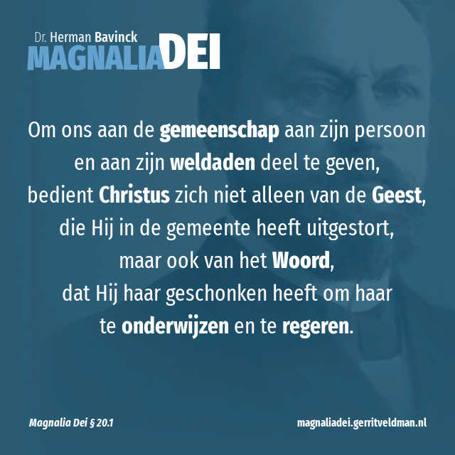 Om ons aan deze gemeenschap aan zijn persoon en aan zijn weldaden deel te geven, bedient Christus zich niet alleen van de Geest, die Hij in de gemeente heeft uitgestort, maar ook van het Woord, dat Hij haar geschonken heeft om haar te onderwijzen en te regeren. En tussen die twee heeft Hij zo’n verband gelegd dat ze samen dienstbaar zijn aan de uitoefening van zijn profetisch, priesterlijk en koninklijk ambt. Maar het is niet gemakkelijke dit verband goed in te zien en duidelijk te omschrijven. Er zijn over de relatie tussen Woord en Geest altijd zeer verschillende gedachten gevormd en deze verschillende voorstellingen blijven tot de dag van vandaag naast elkaar bestaan.