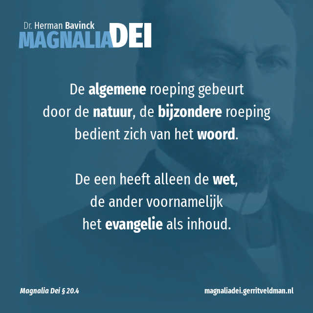 Wanneer wet en evangelie nu op deze manier onderscheiden zijn, dan volgt daaruit dat ook de algemene roeping, die in natuur en geweten naar alle mensen komt, en de bijzondere roeping, die allen bereikt die onder het christendom leven, niet gradueel, maar ook wezenlijk van elkaar verschillen. Het verschil is niet slechts dat het christendom ons een betere, volmaaktere wet laat kennen dan die aan de heidenen bekend is. Nee, het komt vooral uit in dat het christendom ons iets nieuws verkondigt, dat het ons het evangelie brengt en in dat evangelie ons met de persoon van Christus bekendmaakt. Niet in de wet alleen, maar vooral in het evangelie van Gods genade ligt het onderscheid tussen heidendom en christendom, tussen algemene en bijzondere openbaring, tussen de roeping waar alle mensen in delen en de roeping waar alleen de christenen in delen.
