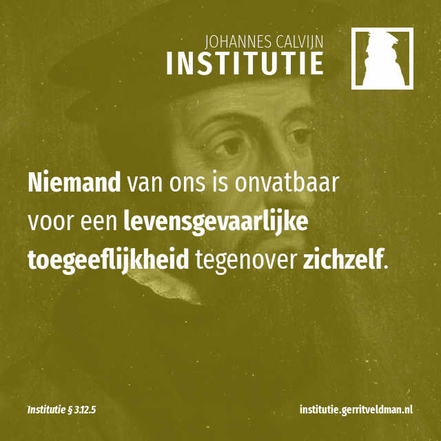 We moeten het niet erg vinden om van het kijken naar deze volmaaktheid van God af te dalen om naar onszelf te kijken, zonder vleierij en zonder blinde neiging tot eigenliefde. Want het is geen wonder als we op dat punt zo blind zijn. Immers, niemand van ons is onvatbaar voor een levensgevaarlijke toegeeflijkheid tegenover zichzelf. De Schrift verklaart dat we daar van nature allemaal mee besmet zijn. Salomo zegt: ‘Voor ieder mens is zijn weg in eigen ogen recht.’ Spreuken 21:2 En: ‘Alle wegen van een mens zijn in zijn eigen ogen zuiver.’ Wat dan? Wordt hij vanwege die misleiding vrijgesproken? Integendeel! In dezelfde passage voegt Salomo toe: ‘De Heer weegt het hart.’ Spreuken 16:2 Dat wil zeggen: de mens streelt zichzelf onder het uiterlijke masker van rechtvaardigheid. Maar ondertussen onderzoekt de Heer de verborgen onreinheid van zijn hart in zijn weegschaal.
