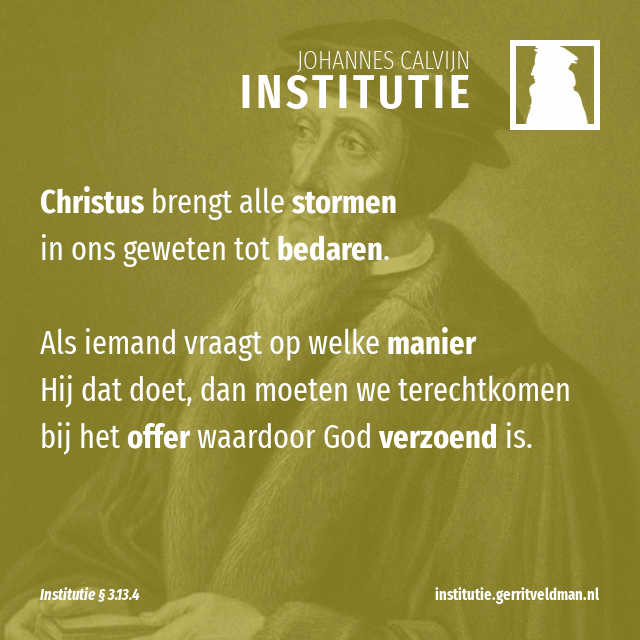 Daarom wordt Christus ook de vredekoning en onze vrede genoemd. Jesaja 9:6; Efeziërs 2:14 Hij brengt alle stormen in ons geweten tot bedaren. Als iemand vraagt op welke manier Hij dat doet, dan moeten we terechtkomen bij het offer waardoor God verzoend is. Want ieder die niet vasthoudt dat God ons alleen gunstig gezind is door die verzoening waardoor Christus zijn woede gedragen heeft, die zal nooit ophouden bang te zijn. Kortom, nergens anders dan in de verschrikkingen van Christus, onze verlosser, moeten wij onze vrede zoeken.