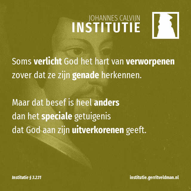 Ik ontken ook niet dat God hun hart zover verlicht dat ze zijn genade herkennen. Maar dat besef is heel anders dan het speciale getuigenis dat God aan zijn uitverkorenen geeft. Verworpenen komen nooit zover dat ze kunnen genieten van het effect van die genade. Want God is hun niet zo goedgezind dat Hij hen daadwerkelijk bevrijdt van de dood en hen in zijn bescherming neemt. Hij laat hun slechts een ogenblik zijn barmhartigheid zien, als bij vlagen. Alleen de uitverkorenen keurt Hij de levende wortel van het geloof waard, zodat wij tot het eind toe volhouden.