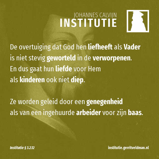 Ik ga nog een stapje verder: op grond van de leer van de Schrift en op grond van onze dagelijkse ervaring staat vast dat verworpenen soms getroffen worden door een besef van Gods genade. Daarom kan het niet anders of er wordt in hun hart een verlangen gewekt om van hun kant ook God lief te hebben. In Saul bijvoorbeeld leefde een tijdlang een vrome genegenheid om God lief te hebben. Want hij wist dat God Hem als een Vader behandelde en daarom trok Gods goedheid hem aan als iets heerlijks. 1 Samuël 9-11 Maar de overtuiging dat God hen liefheeft als Vader is niet stevig geworteld in verworpenen. En dus gaat hun liefde voor Hem als kinderen ook niet diep. Ze worden geleid door een genegenheid als van een ingehuurde arbeider voor zijn baas. Want alleen Christus heeft de Geest van de liefde gekregen, op voorwaarde dat Hij die indruppelt in zijn ledematen. En deze woorden van Paulus reiken zeker niet verder dan de uitverkorenen: ‘Gods liefde is in ons hart uitgestort door de Heilige Geest die ons gegeven is.’ Romeinen 5:5 Dat is de Geest die ons het vertrouwen geeft om God aan te roepen, zoals ik hierboven genoemd heb.