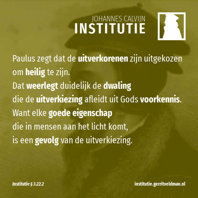 En als je verder vraagt naar de hogere oorzaak, dan antwoordt Paulus dat God het zo van tevoren bepaald heeft en wel volgens het welbehagen van zijn wil. Met die woorden haalt hij alle middelen onderuit waarvan mensen zich inbeelden dat ze die zelf hebben voor hun uitverkiezing. Want hij leert dat alle geschenken die God geeft voor het geestelijk leven voortkomen uit deze ene bron: God heeft uitgekozen wie Hij wilde en voordat ze geboren waren, heeft Hij voor ieder van hen afzonderlijk de genade klaargelegd die Hij hun waard wilde keuren.