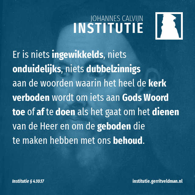 Nee, we moeten inzien dat de benaming ‘kerk’ onterecht gebruikt wordt als het gaat om menselijke willekeur en overmoed die zich niet kan beperken tot Gods voorschriften, maar uitgelaten opspringt en eigen uitvindingen achterna holt. Er is niets ingewikkelds, niets onduidelijks, niets dubbelzinnigs aan de woorden waarin het heel de kerk verboden wordt om iets aan Gods Woord toe of af te doen als het gaat om het dienen van de Heer en om de geboden die te maken hebben met ons behoud.