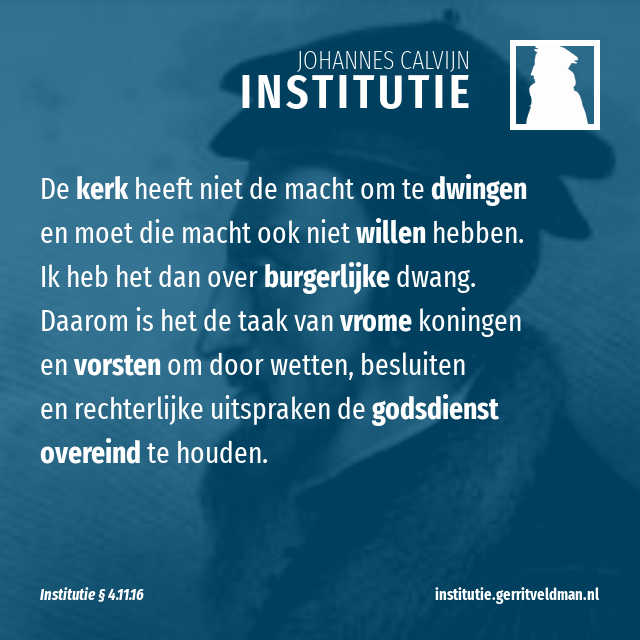 Met deze uitzondering wilden de heilige mannen alleen maar voorkomen dat minder vrome vorsten met hun tirannieke geweld en hun willekeur de kerk zouden hinderen in het uitvoeren van haar taak. Immers, zij keurden het niet af als vorsten soms in kerkelijke zaken hun gezag gebruikten. Als dat maar gebeurde om de orde in de kerk te bewaren en niet om die te verstoren. Als het maar gebeurde om de tucht te bevestigen en niet om die af te breken. De kerk heeft niet de macht om te dwingen en moet die macht ook niet willen hebben. Ik heb het dan over burgerlijke dwang. Daarom is het de taak van vrome koningen en vorsten om door wetten, besluiten en rechterlijke uitspraken de godsdienst overeind te houden.