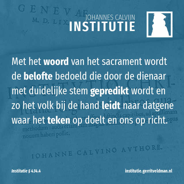Als we horen spreken over het woord van het sacrament, moeten we dus beseffen dat daarmee de belofte bedoeld wordt die door de dienaar met duidelijke stem gepredikt wordt en zo het volk bij de hand leidt naar datgene waar het teken op doelt en ons op richt.