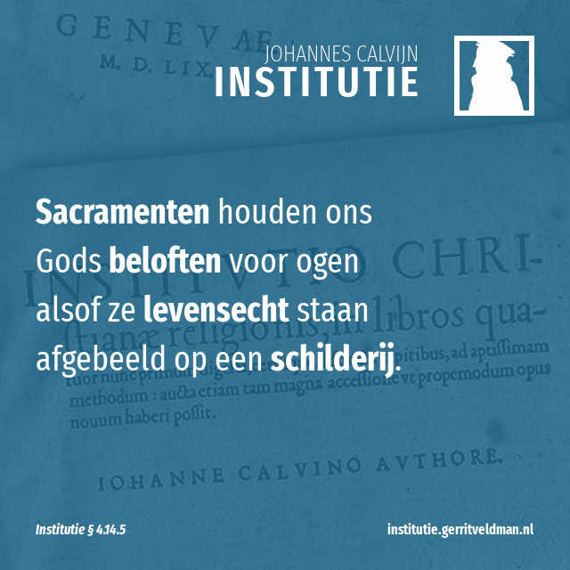 En waarom zou iemand zich eraan ergeren als ik leer dat de belofte bezegeld wordt door de sacramenten? Want uit de beloften zelf blijkt duidelijk dat die door de sacramenten bevestigd worden. Immers, hoe duidelijker een belofte is, hoe beter die geschikt is om het geloof te ondersteunen. Bovendien is het heel duidelijk dat de sacramenten beloften meebrengen. En boven het Woord hebben ze nog dit extra: ze houden ons die beloften voor ogen alsof ze levensecht staan afgebeeld op een schilderij.