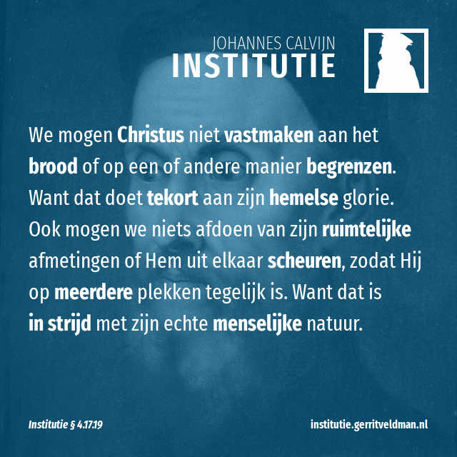 Wij moeten Christus echter op de volgende manier aanwezig zien in het avondmaal. We mogen Hem niet vastmaken aan het element van het brood en Hem niet in het brood insluiten of op een of andere manier begrenzen. Want het is duidelijk dat dat allemaal tekort doet aan zijn hemelse glorie. Ook mogen we niets afdoen van zijn ruimtelijke afmetingen of Hem uit elkaar scheuren, zodat Hij op meerdere plekken tegelijk is, of Hem een oneindige omvang toedichten, die zich uitspreidt over hemel en aarde. Want al deze dingen zijn duidelijk in strijd met een echte menselijke natuur. Nooit, zeg ik, moeten we ons deze twee beperkingen laten afpakken: Christus’ hemelse glorie mag niet tekortgedaan worden. En dat gebeurt wel als Hij onderworpen wordt onder vergankelijke elementen van deze wereld of verbonden wordt met welk aards schepsel ook. En we mogen zijn lichaam niets toedichten dat niet past bij de menselijke natuur. En dat gebeurt wel als je zegt dat zijn lichaam onbegrensd of op meerdere plaatsen tegelijk is.
