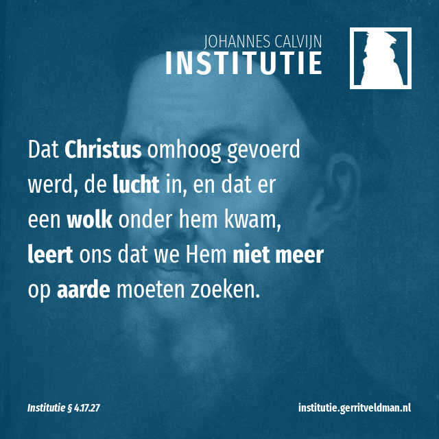 Maar geeft het zo vaak herhaalde woord ‘opvaren’ dan geen verhuizing aan van de ene plek naar de andere? Mijn tegenstanders ontkennen dat. Volgens hen slaat de hoogte alleen maar op de majesteit van zijn koninkrijk. Maar wat betekent dan de manier waarop Hij opgevaren is? Hij voer toch op voor de ogen van zijn leerlingen? De evangelisten vertellen toch duidelijk dat Hij werd opgenomen door de hemel? Handelingen 1:9; Lucas 24:51; Marcus 16:19 Deze scherpzinnige sofisten voeren echter aan dat een wolk Hem aan hun ogen onttrok. Gelovigen zouden daaruit moeten leren dat Hij daarna niet meer zichtbaar zou zijn in de wereld. Alsof Hij dan niet eerder in een ogenblik had moeten verdwijnen of dat een wolk Hem had moeten bedekken voor Hij maar een voet verzette! Dat zou geloof wekken in zijn onzichtbare aanwezigheid. Maar dat Hij omhoog gevoerd werd, de lucht in, en dat er een wolk onder Hem kwam, leert ons dat we Hem niet meer op aarde moeten zoeken. Daarom kan ik veilig concluderen dat Hij nu in de hemel woont, zoals Paulus ook verzekert. Hij beveelt ons dat we Hem daarvandaan moeten verwachten. Filippenzen 3:20