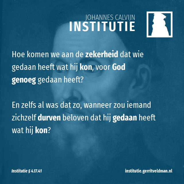Om deze wond te genezen hebben zij een manier bedacht om het het waard te worden: we moeten ons zo goed mogelijk onderzoeken en van onszelf eisen dat we verantwoording afleggen van al onze daden. En dan kunnen we door berouw, biecht en genoegdoening onze onwaardigheid verzoenen. Wat dat voor manier van verzoenen is, heb ik al besproken op een plek die daar meer voor geschikt was. Wat betreft het onderwerp van dit moment zeg ik dat dit een veel te schrale en loze troost is voor mensen met een verslagen geweten, die door hun zonde worden afgeschrikt. Want als de Heer door zijn verbod niemand toelaat om deel te nemen aan zijn avondmaal, behalve wie rechtvaardig en onschuldig is, is er een zeer overtuigende waarborg nodig vóór iemand er zeker van is dat hij de rechtvaardigheid heeft die God van hem eist. Maar hoe komen we aan de zekerheid dat wie gedaan heeft wat hij kon, voor God genoeg gedaan heeft? En zelfs al was dat zo, wanneer zou iemand zichzelf durven beloven dat hij gedaan heeft wat hij kon?