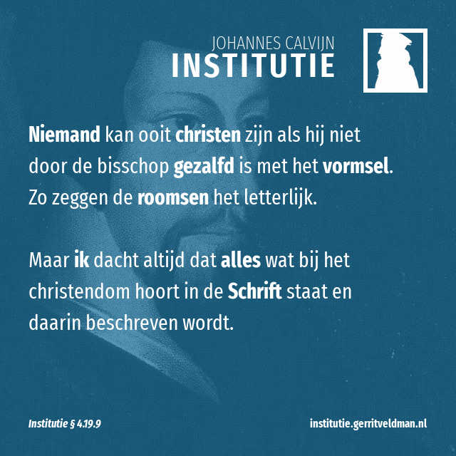 De roomsen voegen daar nog aan toe dat alle gelovigen na de doop de Heilige Geest nog moeten krijgen door handoplegging. Pas dan kunnen ze volledig als christen beschouwd worden. Want niemand kan ooit christen zijn als hij niet door de bisschop gezalfd is met het vormsel. Zo zeggen ze het letterlijk.1 Maar ik dacht altijd dat alles wat bij het christendom hoort in de Schrift staat en daarin beschreven wordt. Maar nu zie ik dat we de ware vorm van de godsdienst ergens anders moeten zoeken en leren. Gods wijsheid, de hemelse waarheid, heel de leer van Christus – dat maakt slechts een begin met het van mensen christenen maken. De olie maakt het af.