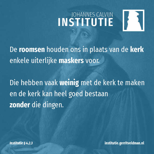 Kijk eens wat voor waarde de opeenvolging heeft als die niet gepaard gaat met imiteren en op dezelfde manier doorgaan: zodra bewezen is dat de opvolgers zijn afgeweken van hun oorsprong, zijn ze alle eer kwijt! Kajafas was de opvolger van vele vrome priesters. Ja, van Aäron af tot hem toe is er een ononderbroken rij priesters geweest. Was die misdadige vergadering daarom de naam ‘kerk’ waard? Zelfs bij wereldlijke regeringen zou zoiets onverdraaglijk zijn! Stel je voor dat we de tirannie van Caligula, Nero, Heliogabalus1 en dergelijken de juiste toestand van het gemenebest van de stad Rome zouden noemen, omdat zij goede leiders als Brutus,2 Scipio en Camillus opgevolgd hebben, die door het volk waren aangesteld! Maar vooral in het bestuur van de kerk is niets zo absurd als dat we de opeenvolging alleen leggen in personen en de leer aan de kant schuiven.