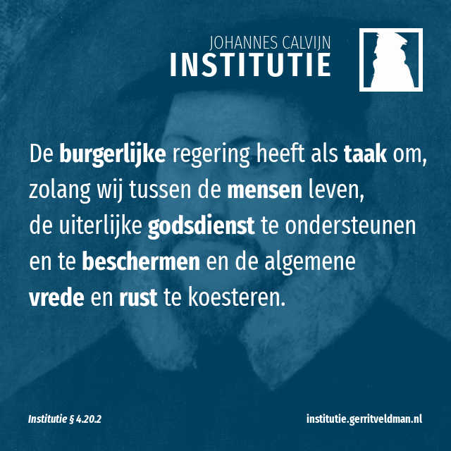 Maar ik heb er eerder al op gewezen dat er onderscheid is tussen dit soort regering en het geestelijke en innerlijke koninkrijk van Christus. En nu moeten we ook weten dat die twee in niets met elkaar in strijd zijn. Want Gods koninkrijk begint weliswaar nu al op aarde in ons de eerste beginselen van het hemelse koninkrijk te bewerken. In dit sterfelijke en vergankelijke leven begint het nu al iets van het onsterfelijke en onvergankelijke geluk. Maar de burgerlijke regering heeft als taak om, zolang wij tussen de mensen leven, de uiterlijke godsdienst te ondersteunen en te beschermen, de gezonde leer van de vroomheid en de positie van de kerk te verdedigen, ons leven in te richten voor de menselijke samenleving, onze moraal te vormen naar burgerlijke rechtvaardigheid, ons met elkaar te verbinden en de algemene vrede en rust te koesteren.