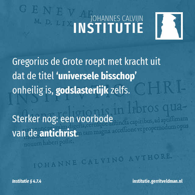Pas in de tijd van Gregorius de Grote ontstond er discussie over de titel ‘universele bisschop’. De aanleiding daarvoor vormde de eerzucht van Johannes,1 bisschop van Constantinopel. Hij wilde zichzelf universele bisschop maken, iets dat nog nooit iemand geprobeerd had. In die discussie voert Gregorius niet aan dat hem werd afgepakt waar hij recht op had. Nee, hij roept hier met kracht tegen uit dat deze titel onheilig is, godslasterlijk zelfs. Sterker nog: een voorbode van de antichrist.